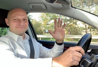 mladý muž jede v autě, řídí, usmívá se do objektivu a mává