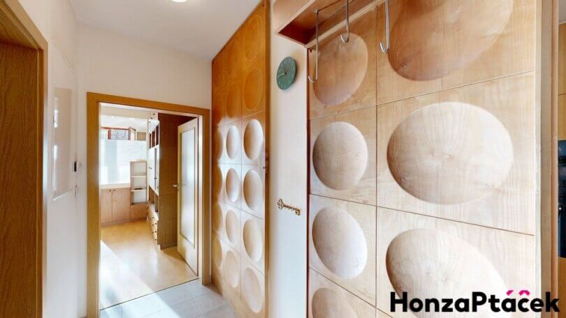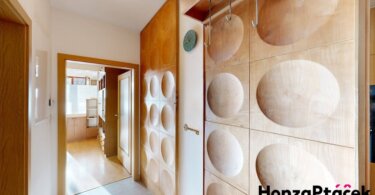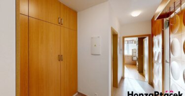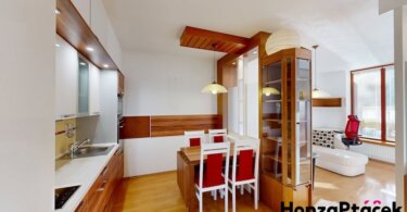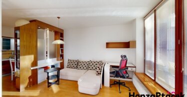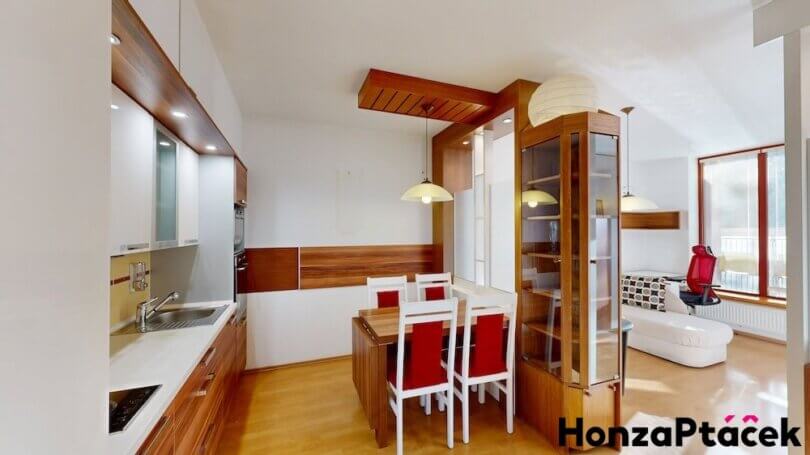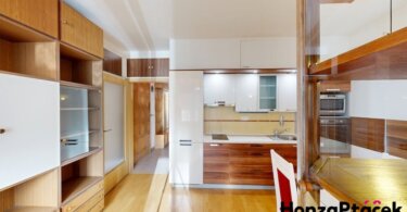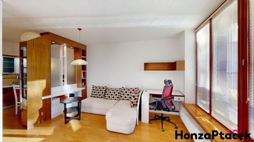 Interiér bytu je vybaven kuchyňskou linkou se spotřebiči, praktickými vestavěnými skříněmi, nábytkem na míru včetně chytré výsuvné postele a úložnými skříňkami na lodžii. Díky zasklené lodžii orientované do zeleně získáte ideální prostor pro relaxaci po celý rok.