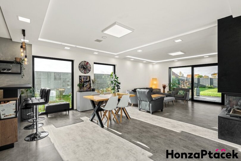 Užitná plocha 147 m² je rozvržená tak, aby každý prostor dával smysl. Srdcem domu je prostorný obývací pokoj s krbem a velkými francouzskými okny, který propojuje interiér se zahradou. Na něj navazuje kuchyň s linkou na míru a vestavěnými spotřebiči Siemens. K dispozici je také technická místnost se sprchou, praktická spíž a šatna přímo u ložnice.