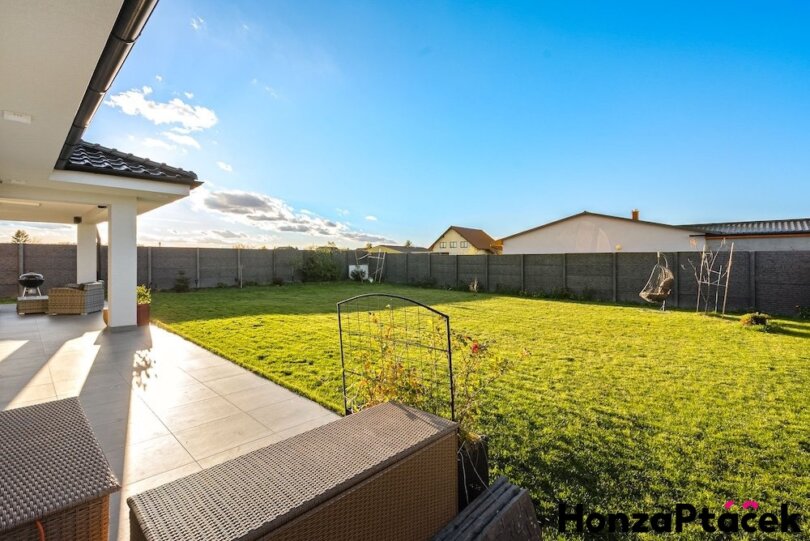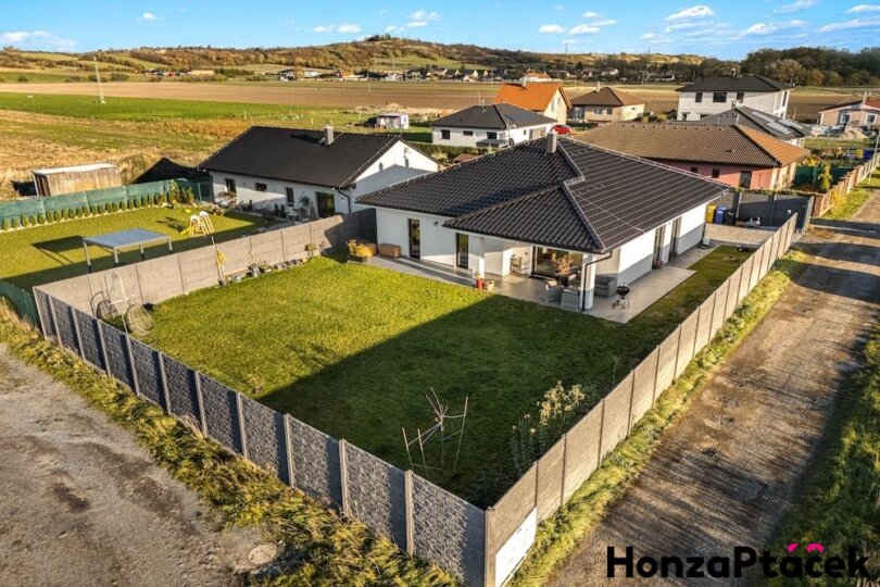 Rovinatý pozemek o rozloze 811 m² je plně oplocený a ideální pro relaxaci, zahradní úpravy nebo dětské zázemí. Díky promyšlenému osazení domu nabízí skutečné soukromí. Dešťová voda je sbírána do podzemní retenční nádrže. Parkování pohodlně přímo na pozemku.