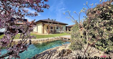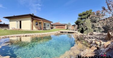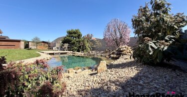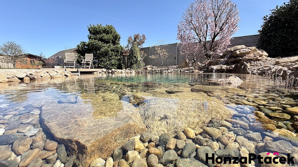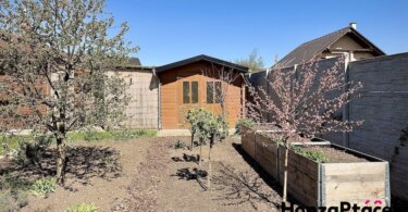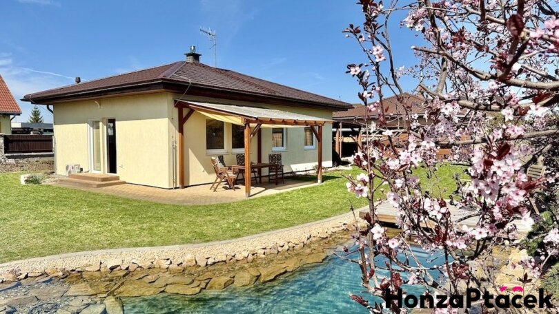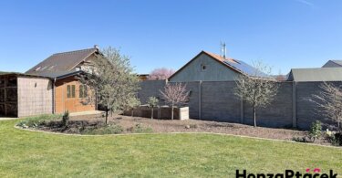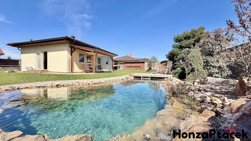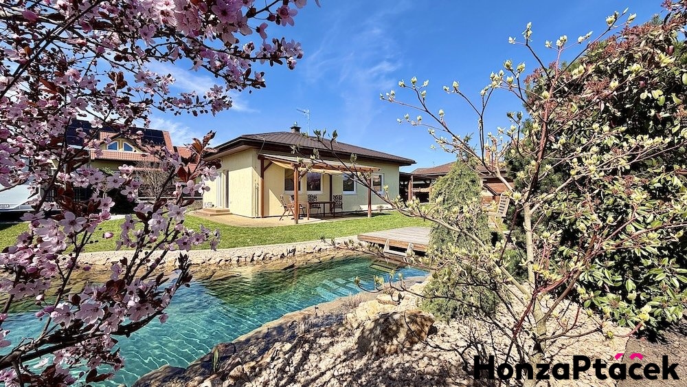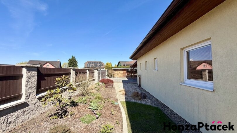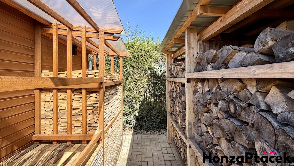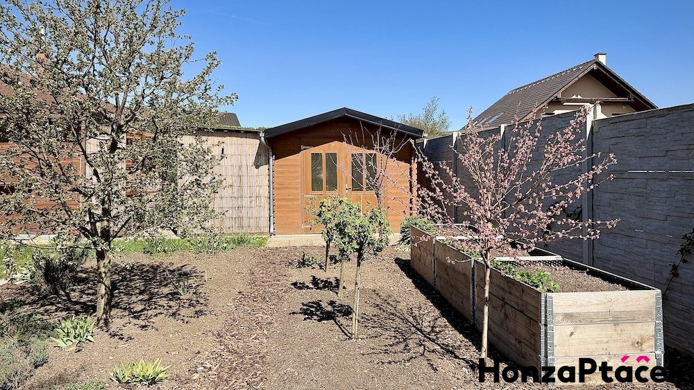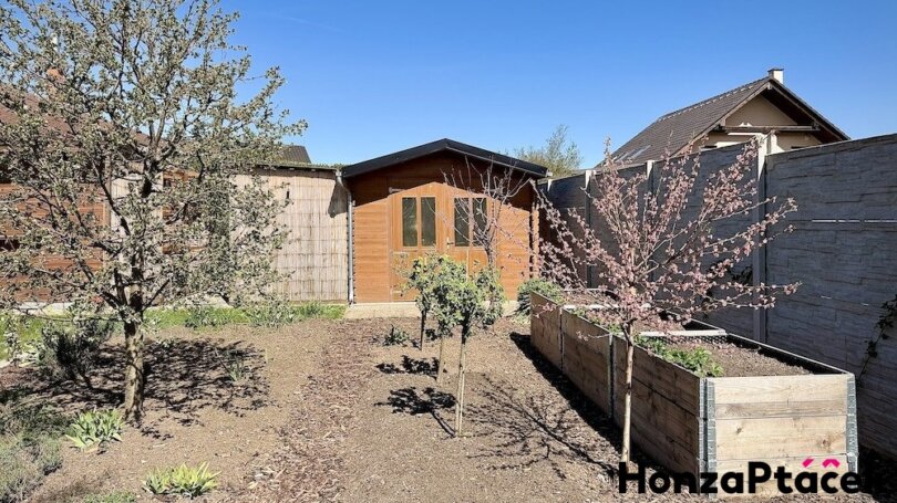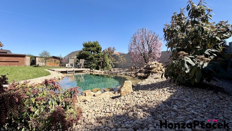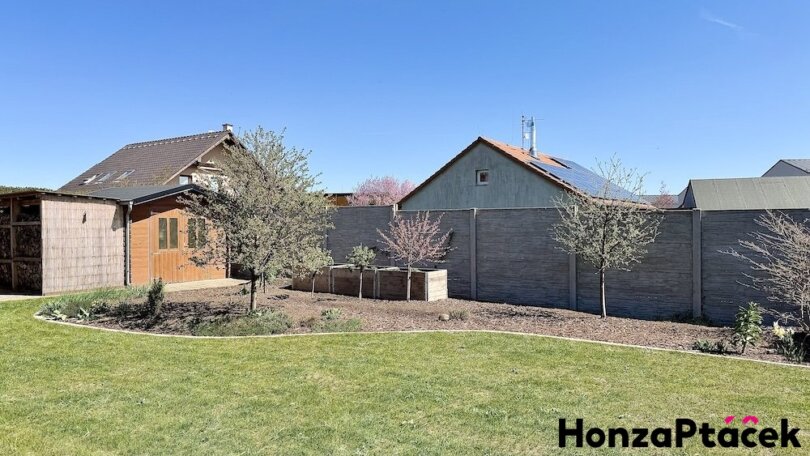 Na zahradě se nachází koupací přírodní jezírko s vodopádem (2025), dva zahradní domky, dřevník, zastřešené stání pro dvě auta a pergola přizpůsobená pro obytný vůz. Na okraji pozemku je zahradní domek s dílničkou a druhý jako sklad nářadí. Na zahradě najdete – okrasné dřeviny, ovocné stromy a keře, nový trávník, vyvýšené záhony tvořící příjemné zázemí pro odpočinek i drobné zahradničení. Zahrada byla v uplynulém roce kompletně revitalizována. Součástí prodeje je také zásoba dřeva na několik topných sezón – cca 16 m3. Pozemek má dva vjezdy opatřené posuvnými bránami (jedna s elektromotorem).