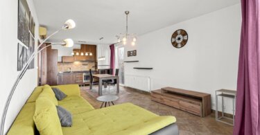 Byt je částečně zařízený a připravený k pohodlnému bydlení. K dispozici je kuchyňská linka, vestavěné skříně, pohovka a vybavení obývacího pokoje i ložnic. Dispozice bytu nabízí koupelnu s WC a další samostatné WC v předsíni.