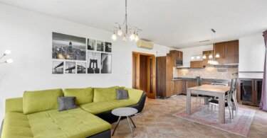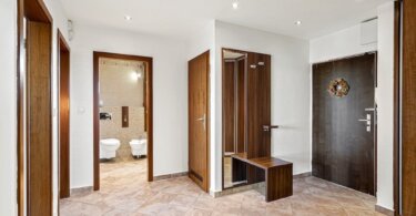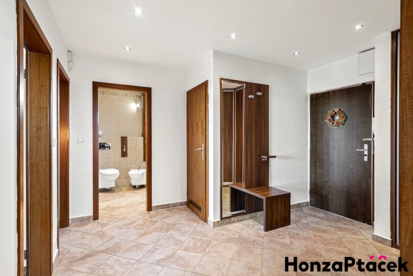 Byt je částečně zařízený a připravený k pohodlnému bydlení. K dispozici je kuchyňská linka, vestavěné skříně, pohovka a vybavení obývacího pokoje i ložnic. Dispozice bytu nabízí koupelnu s WC a další samostatné WC v předsíni.